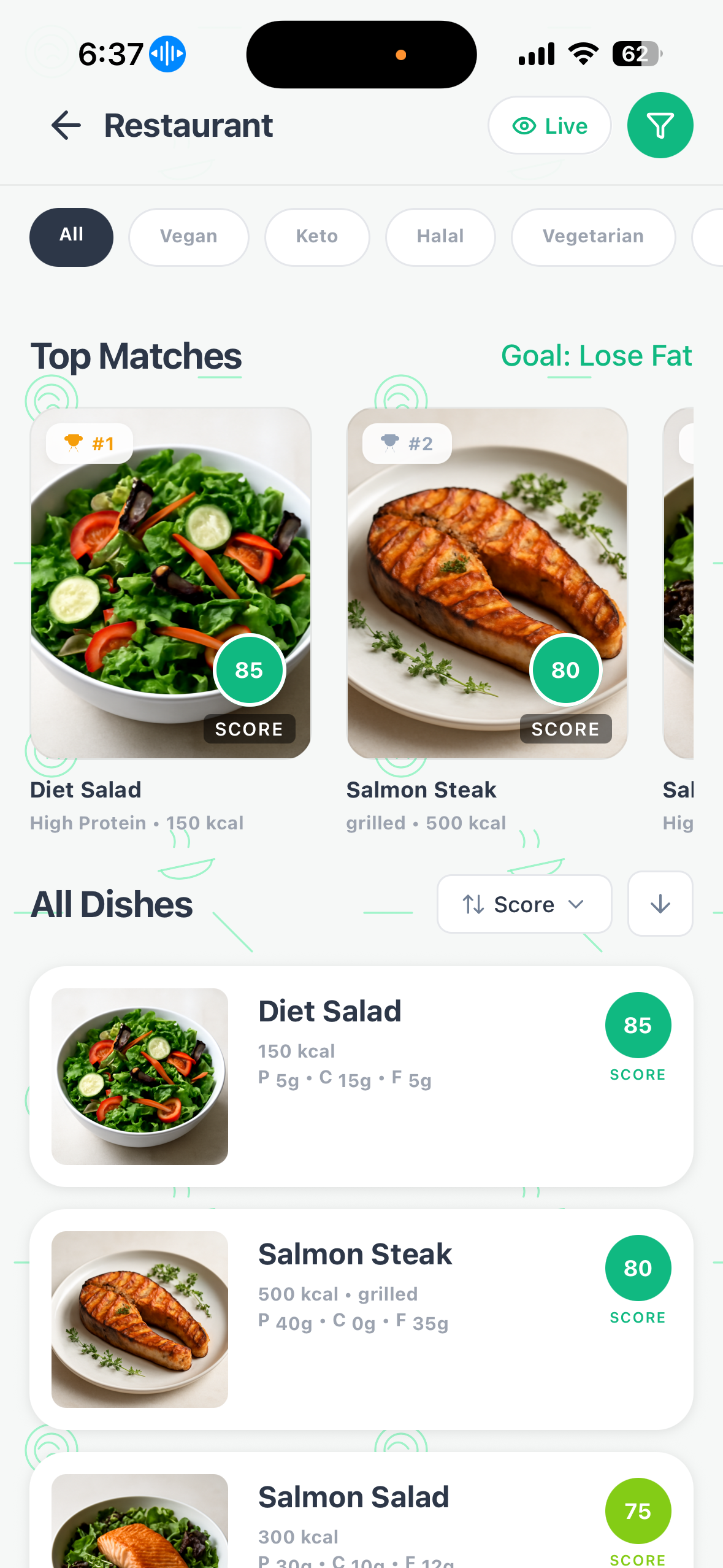 Every dish gets a score from 0 to 100. The higher the score, the better it fits your personal health goals.
