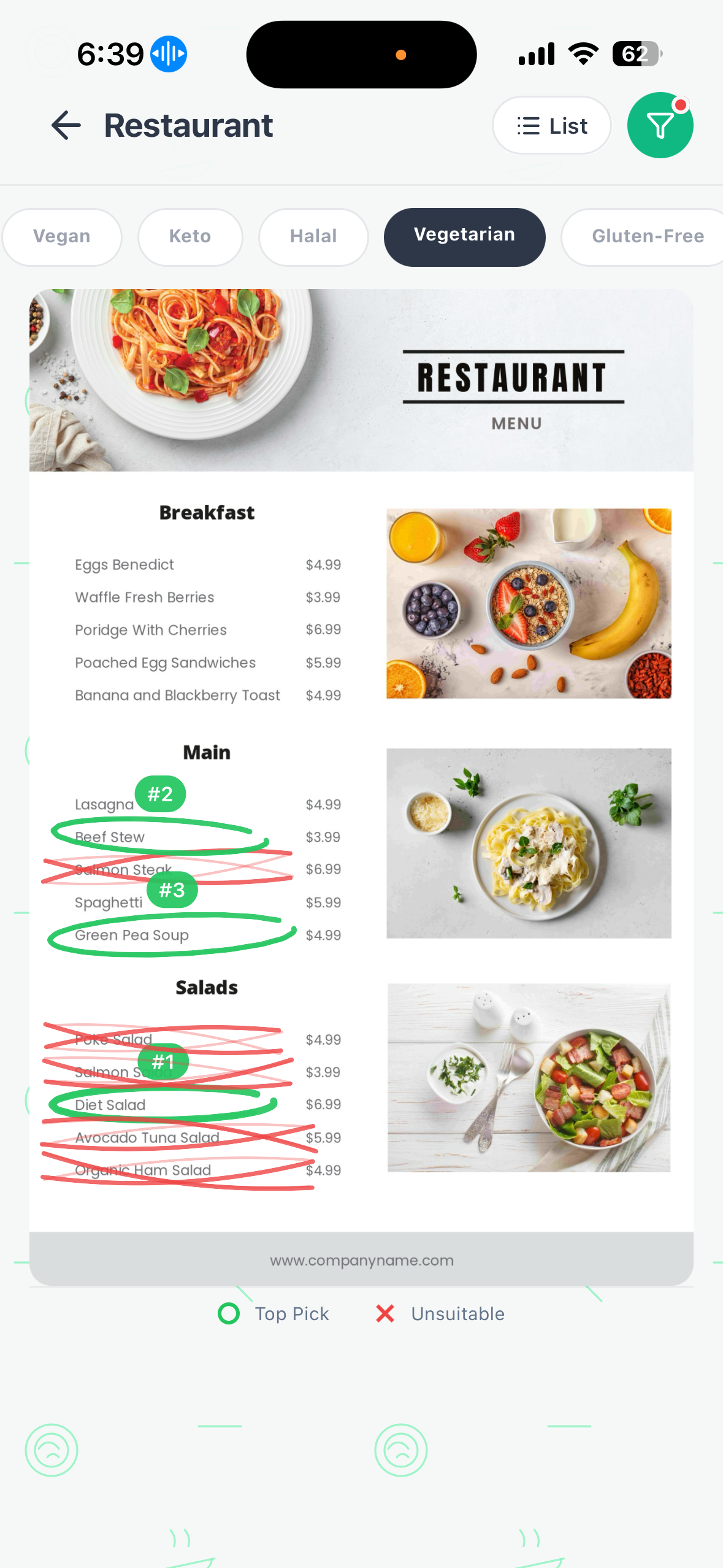 Quickly filter by dietary preferences like vegan, keto, or halal. The app highlights suitable dishes and flags any conflicts.