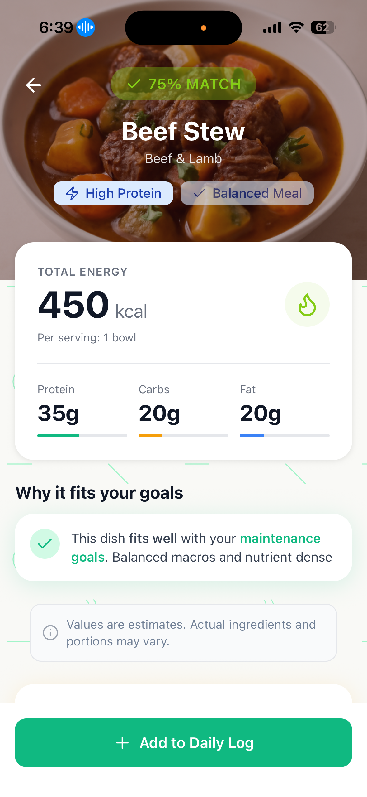 We analyze estimated calories, protein, carbs, and fats to determine how well a dish supports your nutritional needs.